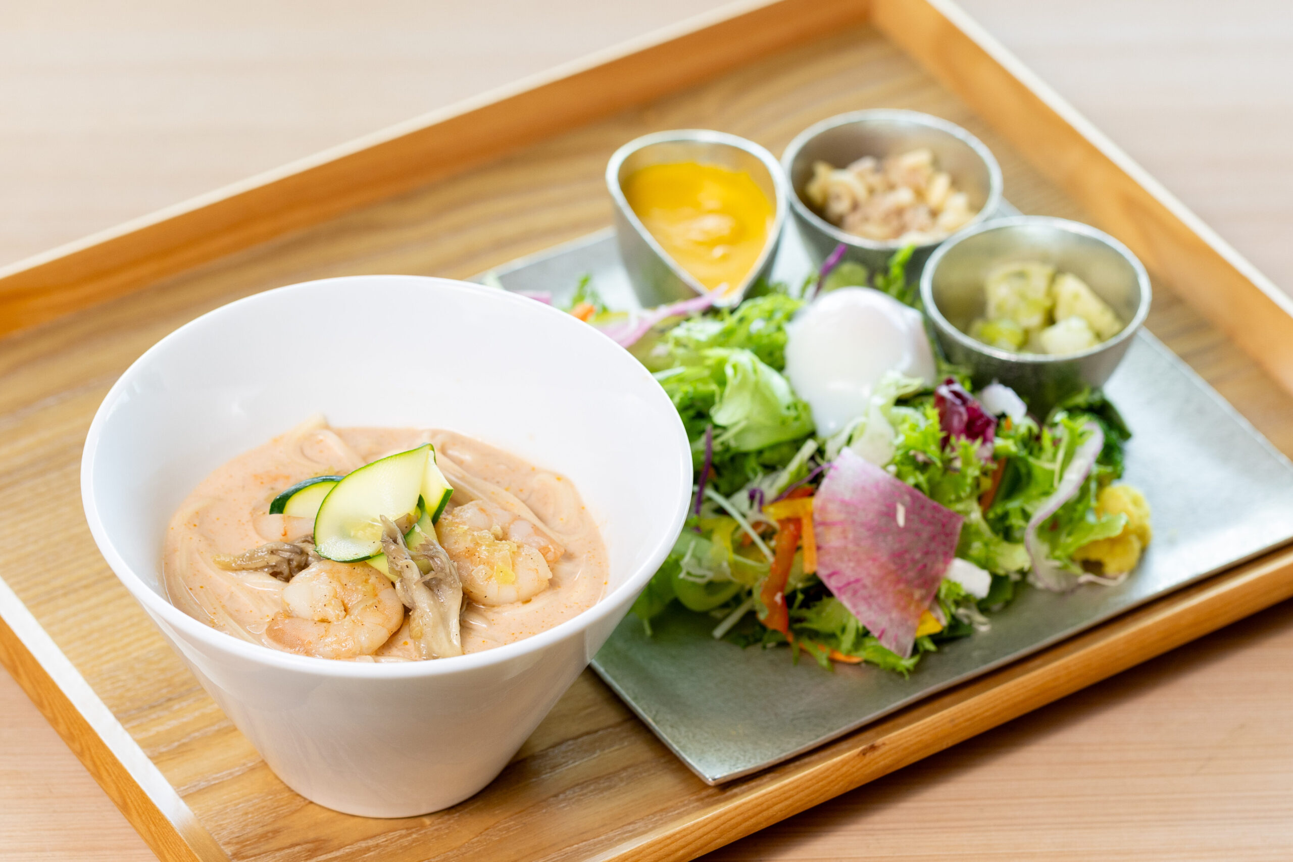 手延べ製法による強いコシと、つるりとしたのど越しが特長の富山名物・氷見うどんに、海老の旨みが広がるやさしい味わいのクリームソースを合わせました。ズッキーニのスライスと、ブラックペッパーをアクセントに効かせたガーリックシュリンプをトッピング。