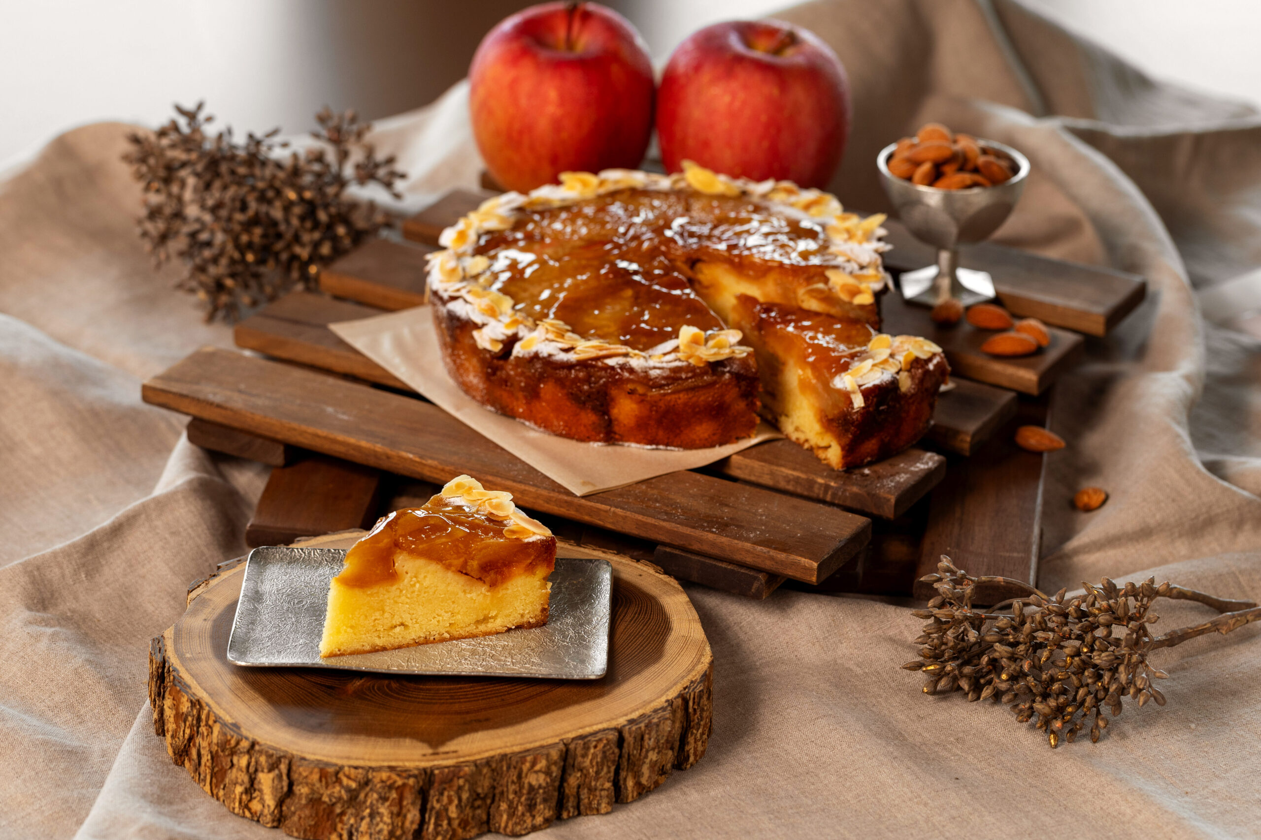 りんごとアーモンドのパウンドケーキ。アーモンドと富山県産の卵を贅沢に使った生地に、キャラメリゼした旬のりんごを重ね、丁寧にしっとりと焼き上げました。タルトタタン風のパウンドケーキです。アーモンドの奥深い香ばしさと、りんごの甘酸っぱさにほろ苦さが重なり合う、豊かな味わいをお楽しみください。