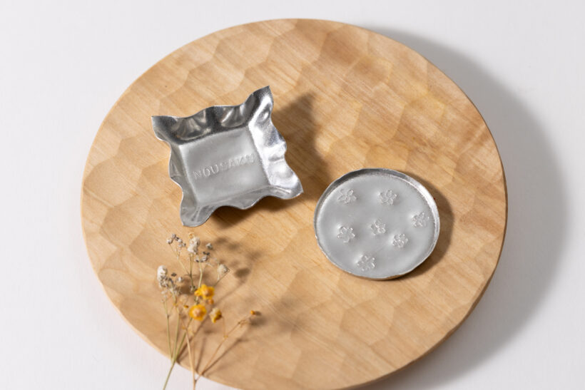 薄い錫の板をハサミで切って曲げて、可愛らしい豆皿が作れるワークショップを開催いたします。お名前やイニシャルの刻印を入れたり、お好きなデザインの模様をつけたりしていただけます。ぜひこの機会にご参加ください。