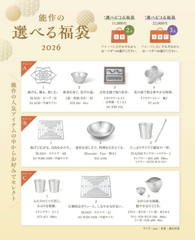 日頃のご愛顧に感謝を込めて、「能作の選べる福袋2026」をご用意いたしました。
