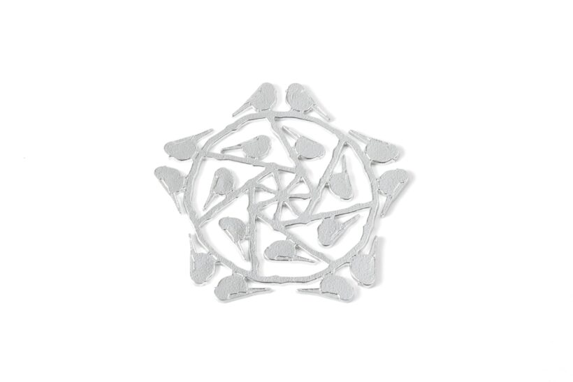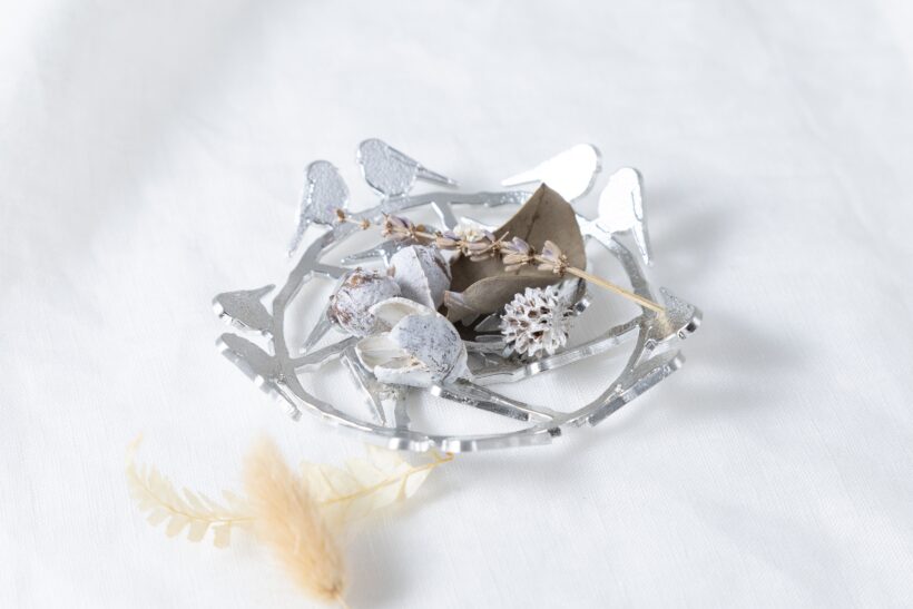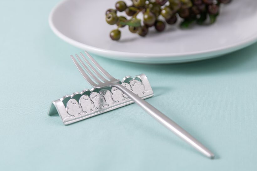 枝の上に並び、小さな体をそっと寄せ合う小さなシマエナガたち。“シマエナガ団子”と呼ばれるやさしい情景を、カトラリーレストに込めました。