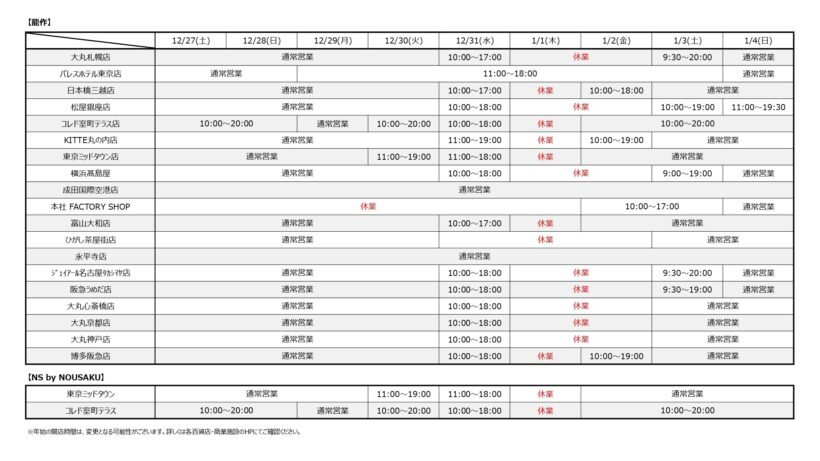 ※年始の開店時間は、変更となる可能性がございます。詳しくは各百貨店・商業施設のHPにてご確認ください。