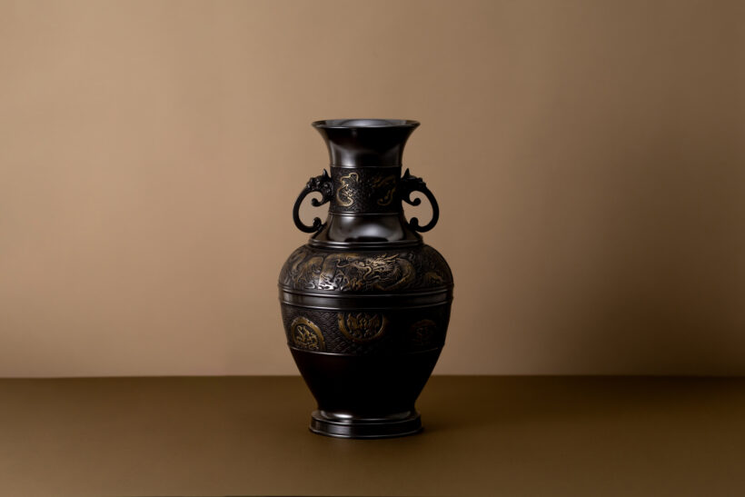 伝統の造形・加飾により生み出された、重厚感のある真鍮花器です。